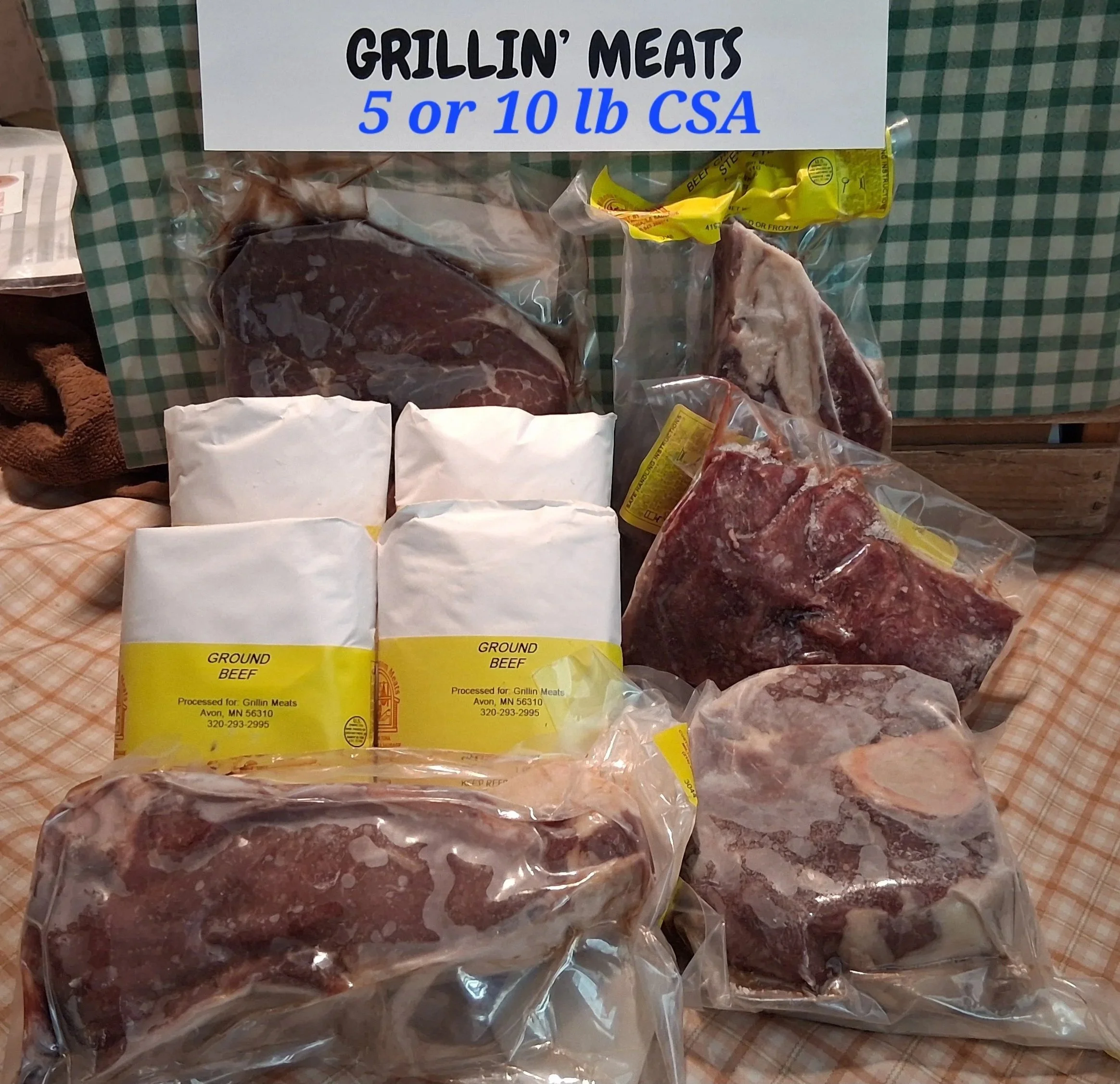 BEEF boxes: We have 3 beef options. They include the 5 pound per month, or 10 pound per month. It’s 1 grocery bag in size. and includes the following: 4 ground, 1 roast or ribs, 1 stew, and 2-3 steaks to be 10 or more pounds. (the 5 lb is an every other month delivery) The third option is DOUBLE what’s in the 10 pound, but has a wider variety of steaks in each box. There is NOT 2 of each kind of steak per box. we carry 13 different cuts of steaks, you will get a balance that will even out the box. Further: the 10- pound is after a year, equal to if you had bought a quarter, but got it in BITE SIZE Pieces = convenience!